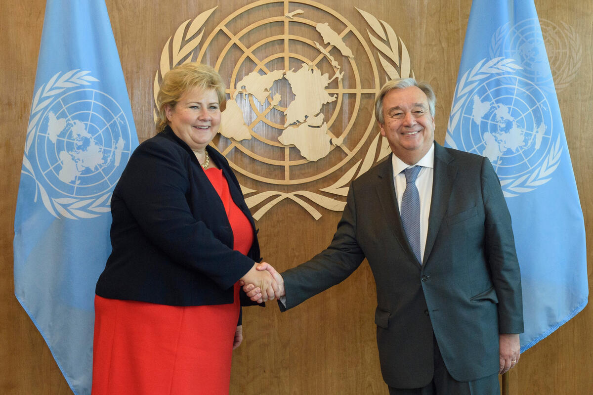 Secretary-General António Guterres (right) meets with Erna Solberg, Prime Minister of Norway.