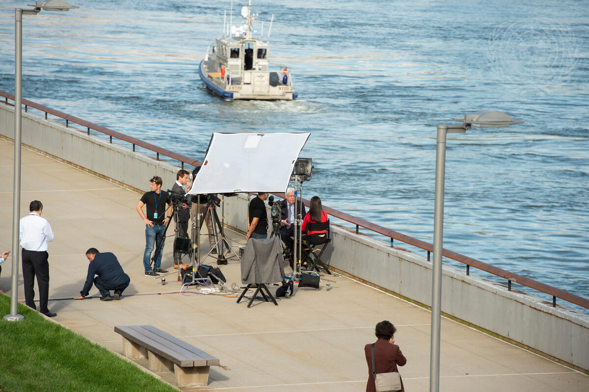 A television interview is recorded on the riverside promenade at UN Headquarters, on the third day of the General Assembly's seventy-third general debate.
