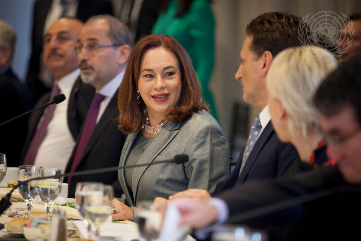 María Fernanda Espinosa Garcés (centre), President of the seventy-third session of the General Assembly, speaks with Pierre Krähenbühl, Commissioner General for UNRWA, and Margot Wallström, Minister for Foreign Affairs of Sweden at the Ministerial Meeting on United Nations Relief and Works Agency for Palestine Refugees in the Near East (UNRWA). At left is Mevlüt Çavusoglu, Minister for Foreign Affairs of the Republic of Turkey, and Ayman H. Safadi, Minister for Foreign Affairs and Expatriates of the Hashemite Kingdom of Jordan.