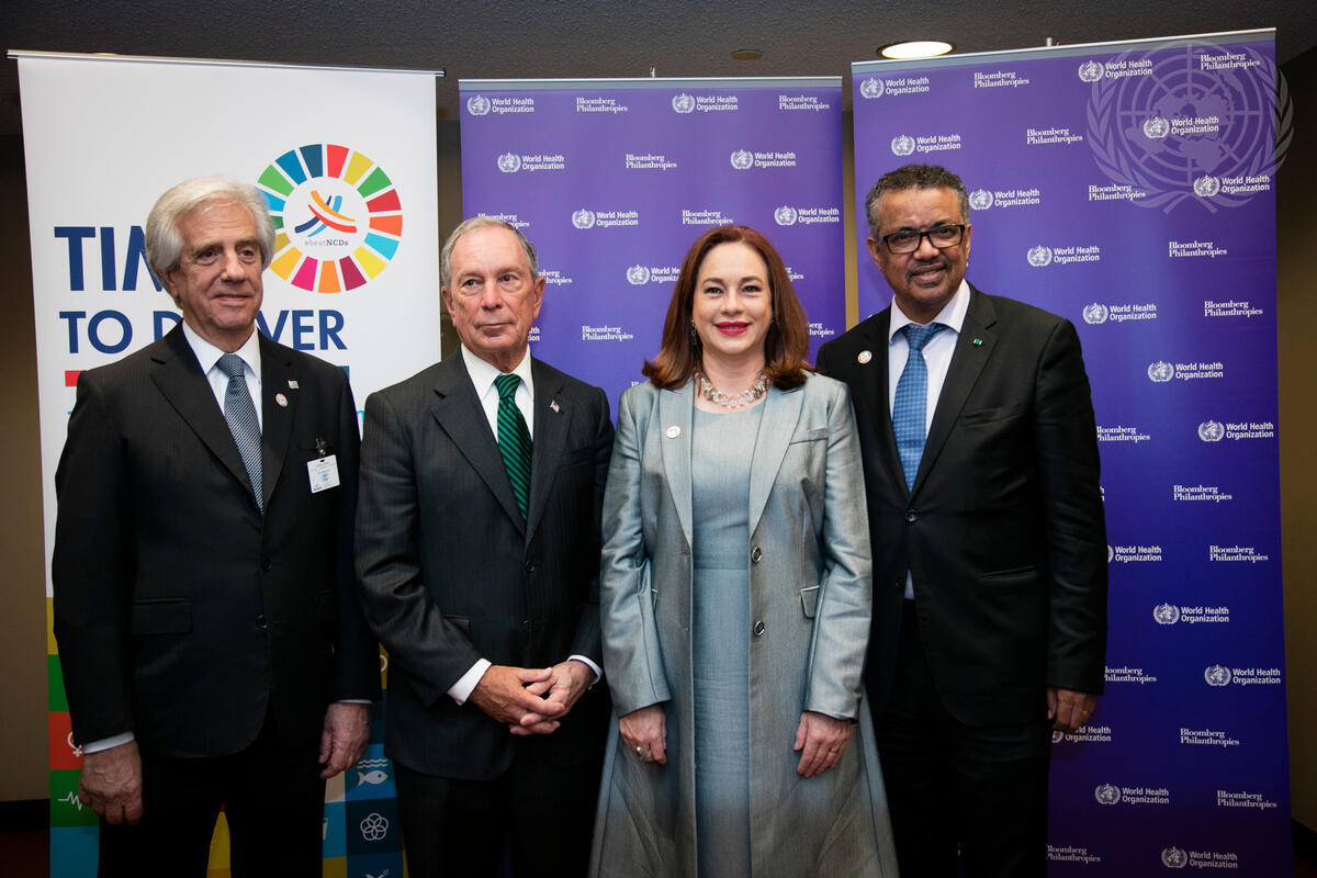 María Fernanda Espinosa Garcés (centre right), President of the seventy-third session of the General Assembly, meets with (from left to right) Tabaré Vázquez, President of Uruguay; Michael R. Bloomberg, Special Envoy for Climate Action; and Tedros Adhanom Ghebreyesus, Director-General of the World Health Organization (WHO).