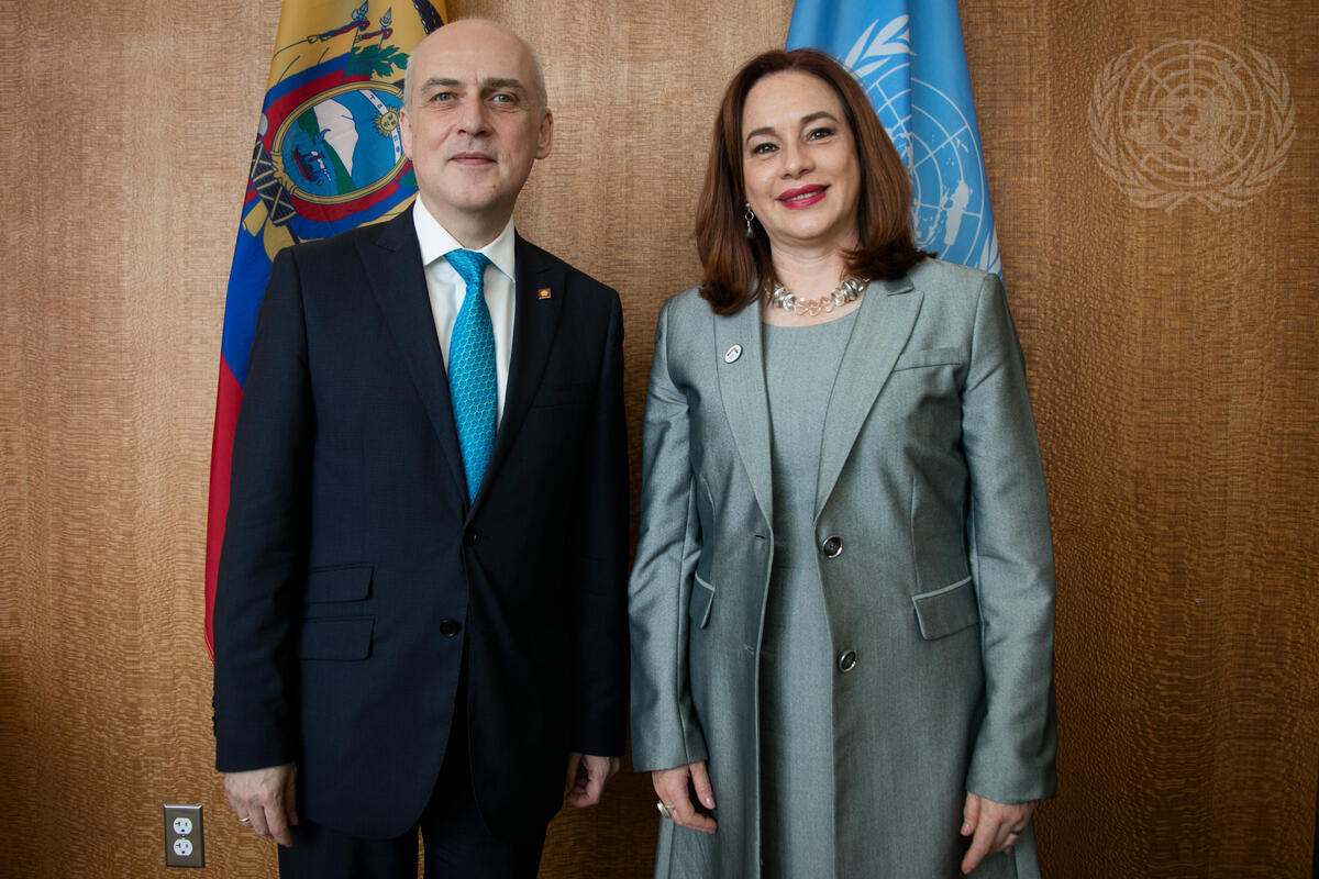 María Fernanda Espinosa Garcés (right), President of the seventy-third session of the General Assembly, meets with David Zalkaliani, Minister of Foreign Affairs of Georgia.