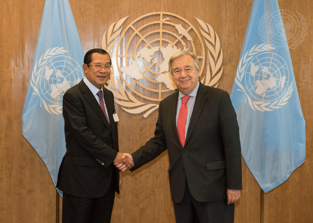 Secretary-General António Guterres (right) meets with Samdech Akka Moha Sena Padei Techo Hun Sen, Prime Minister of the Kingdom of Cambodia.