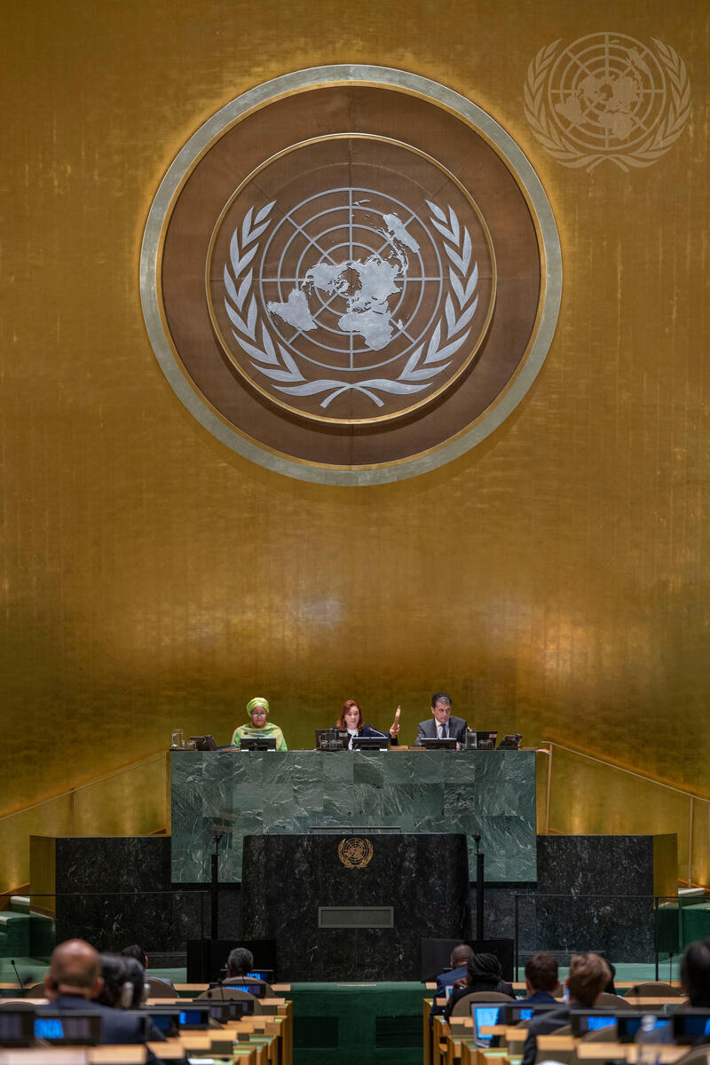 María Fernanda Espinosa Garcés (centre at dais), President of the seventy-third session of the General Assembly, chairs the fifth day of the general debate of the Assembly's seventy-third session. She is flanked by Deputy Secretary-General Amina Mohammed (left), and Movses Abelian, Assistant Secretary-General for General Assembly and Conference Management.