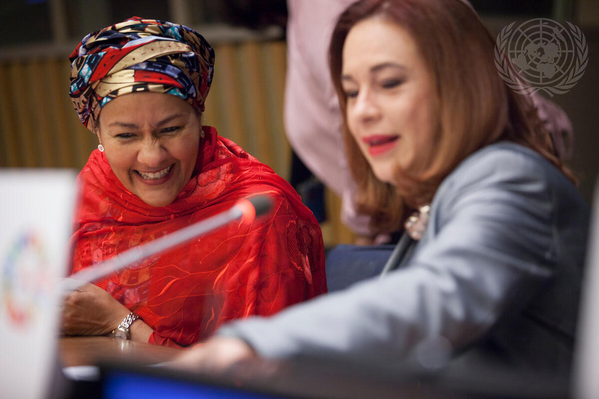 María Fernanda Espinosa Garcés (right), President of the seventy-third session of the General Assembly, shares a moment with Deputy Secretary-General Amina Mohammed, as she is about to make remarks during the high-level meeting on the theme of scaling up multi-stakeholder and multisectoral responses for the prevention and control of non-communicable diseases in the context of the 2030 Agenda for Sustainable Development.