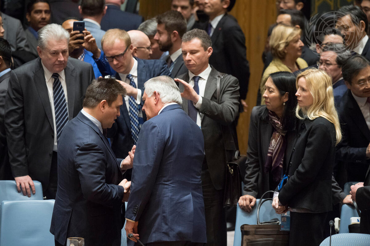 Pavlo Klimkin (front left), Minister for Foreign Affairs of Ukraine, speaks with Rex W. Tillerson, Secretary of State of the United States of America, after the Council’s meeting on non-proliferation by the Democratic People's Republic of Korea (DPRK).