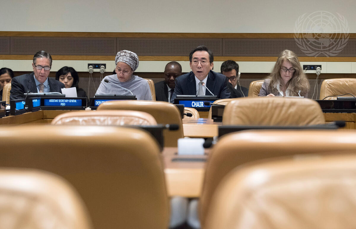 Also pictured to his right: Deputy Secretary-General Amina Mohammed and Oscar Fernández-Taranco, Assistant Secretary-General for Peacebuilding Support.