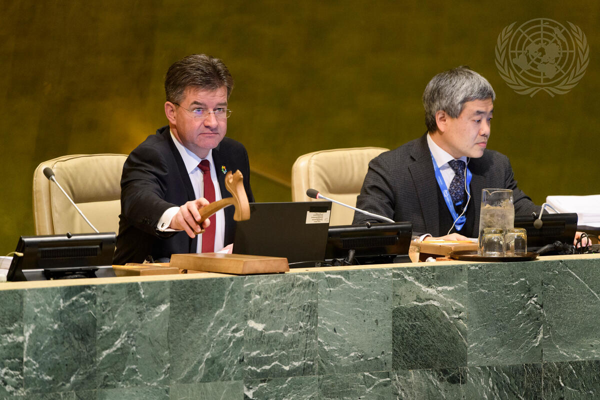 Miroslav Lajcák (left), President of the UN General Assembly, presides over the seventy-third plenary meeting of the seventy-second session of the General Assembly. At his side is Kenji Nakano, Chief of the General Assembly Affairs Branch, Department for General Assembly and Conference Management (DGACM).