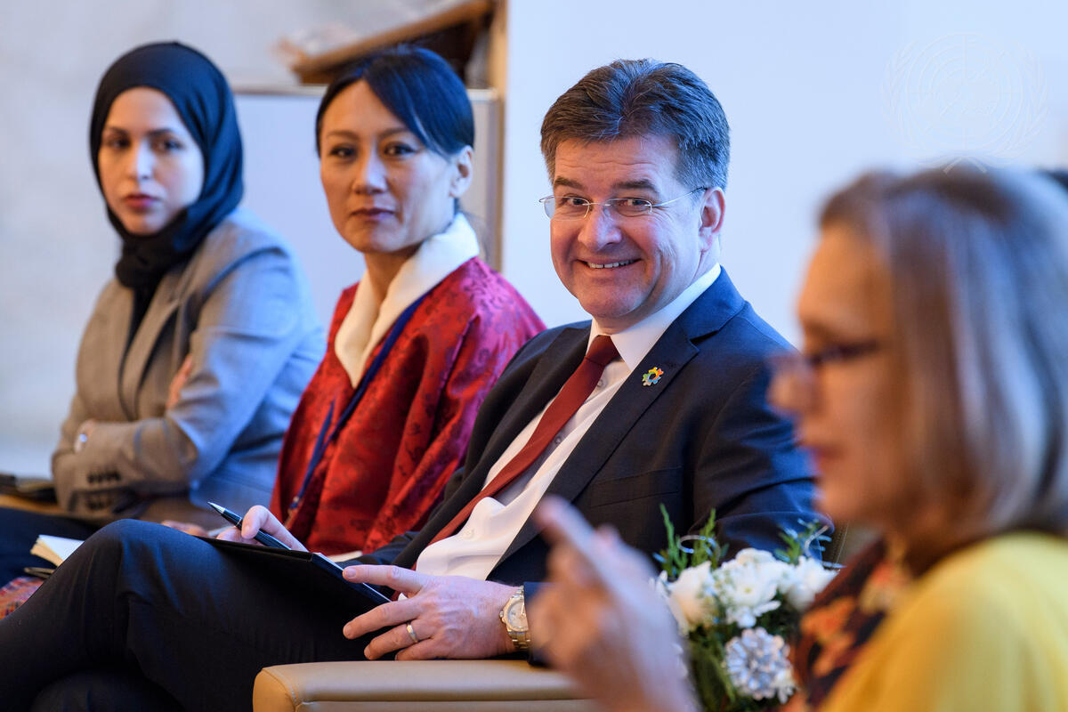 Miroslav Lajcák (second from right), President of the seventy-second session of the General Assembly holds a morning dialogue with United Nations Permanent Representatives on the topic of enhancing closer cooperation and coherence between New York, Geneva, Nairobi and Vienna UN Offices.