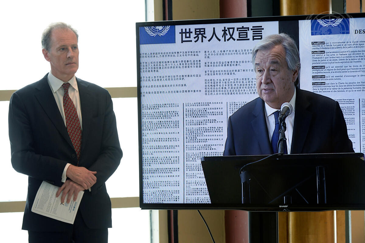 Mr. Guterres (speaking out of frame) is seen on the screen at right. The event was co-organized by the Office of the High Commissioner for Human Rights (OHCHR) and the Department of Public Information (DPI).