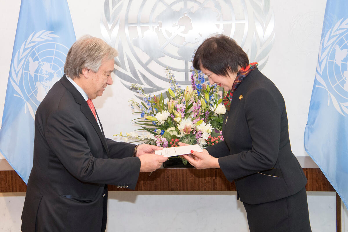Joanna Wronecka (right), new Permanent Representative of the Republic of Poland to the United Nations, presents her credentials to Secretary-General António Guterres.