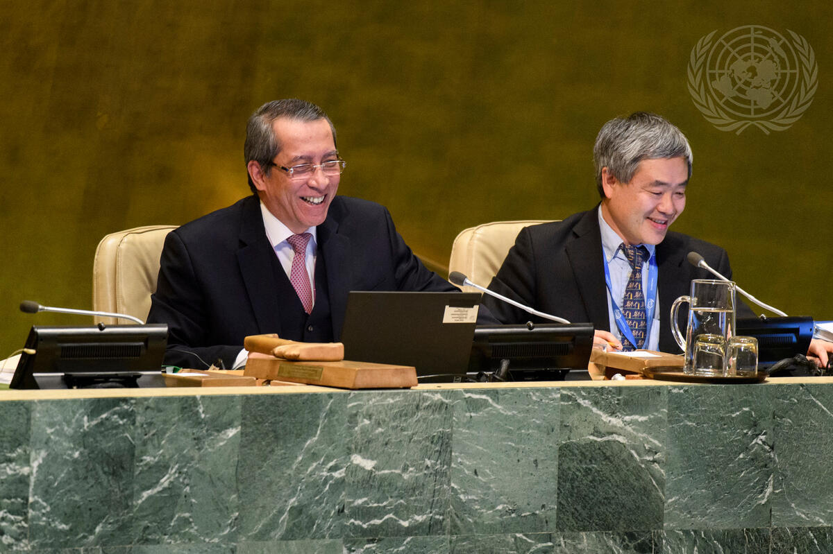 Caption Description Dian Triansyah Djani (left), Permanent Representative of the Republic of Indonesia, presides over the seventy-fourth plenary meeting of the seventy-second session of the General Assembly. At his side is Kenji Nakano, Chief of the General Assembly Affairs Branch, Department for General Assembly and Conference Management (DGACM).