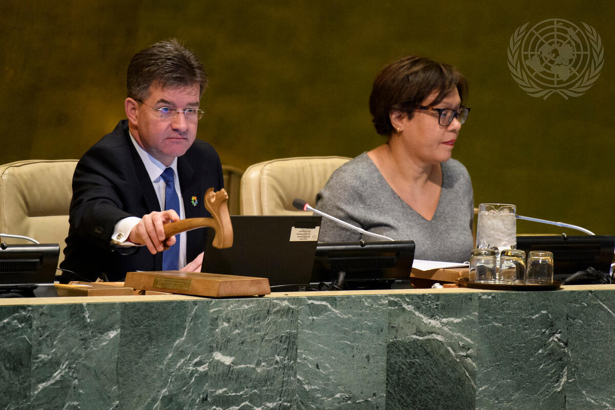 Miroslav Lajcák (left), President of the seventy-second session of the General Assembly, presides over the seventy-fourth plenary meeting. At his side is Ruth de Miranda, Director of the General Assembly and Economic and Social Council (ECOSOC) Affairs Division.