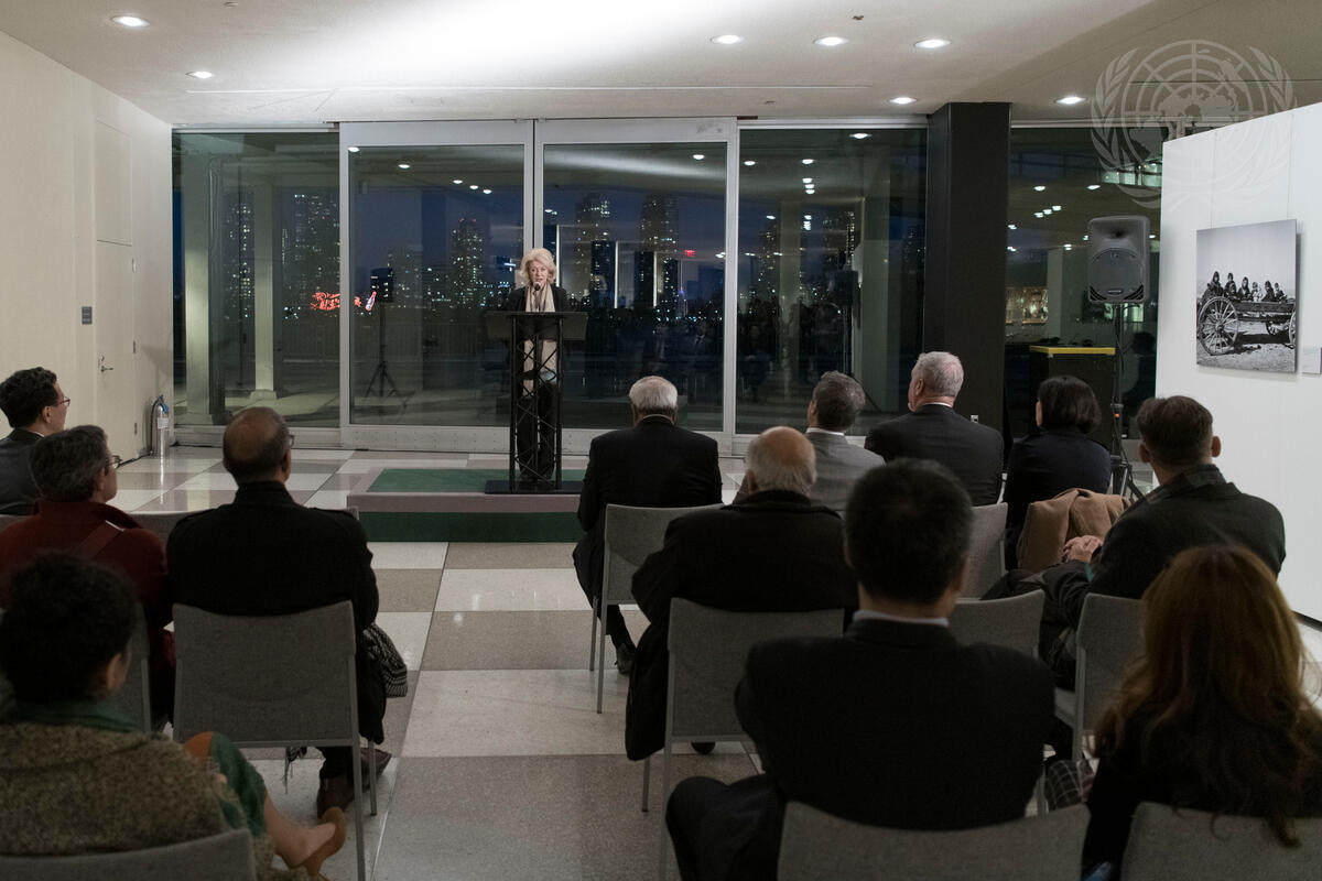 Alison Smale, Under-Secretary-General for Global Communications, makes remarks at the opening of the photo exhibit ""People on the Move"", organized by the UN Department of Public Information with the support of the International Photographic Council and Lifetouch.