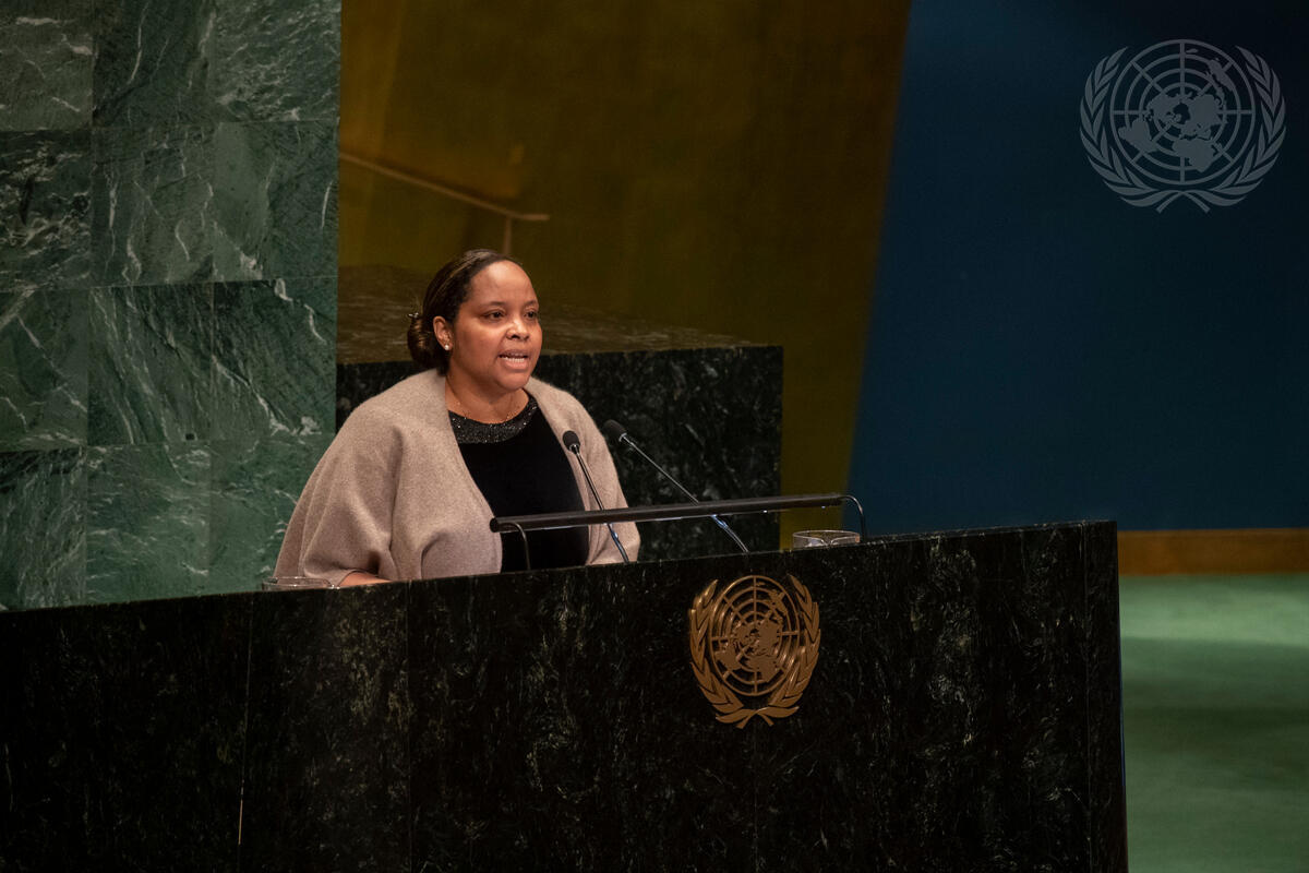 Keisha A. McGuire, Permanent Representative of Grenada, addresses the General Assembly meeting on the necessity of ending the economic, commercial and financial embargo imposed by the United States against Cuba.