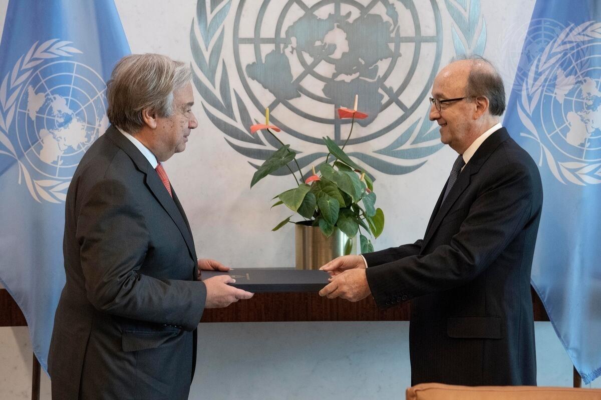 Guillermo Roquel Fernandez de Soto Valderrama (right), new Permanent Representative of the Republic of Colombia to the United Nations, presents his credentials to Secretary-General António Guterres.