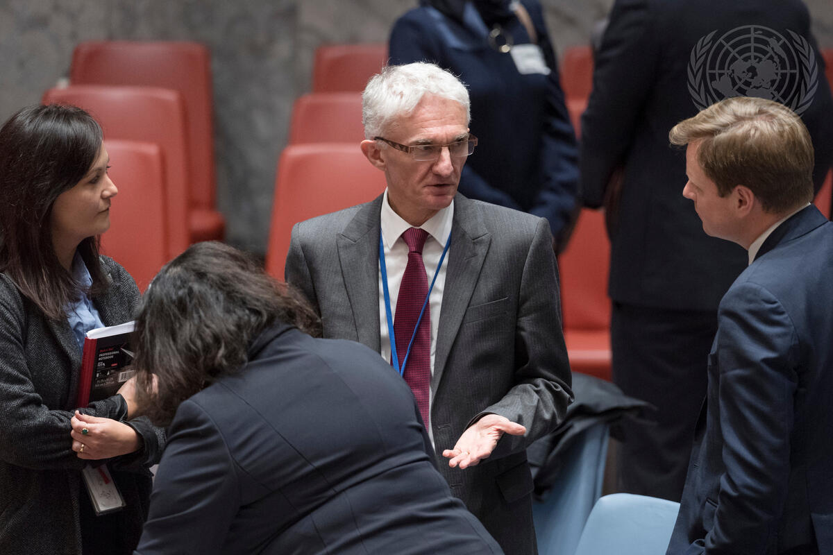 Mark Lowcock (centre), Under-Secretary-General for Humanitarian Affairs and Emergency Relief Coordinator, speaks with a representative from the Permanent Mission of the United Kingdom to the UN, after the Security Council meeting on the situation in the Middle East (Syria).