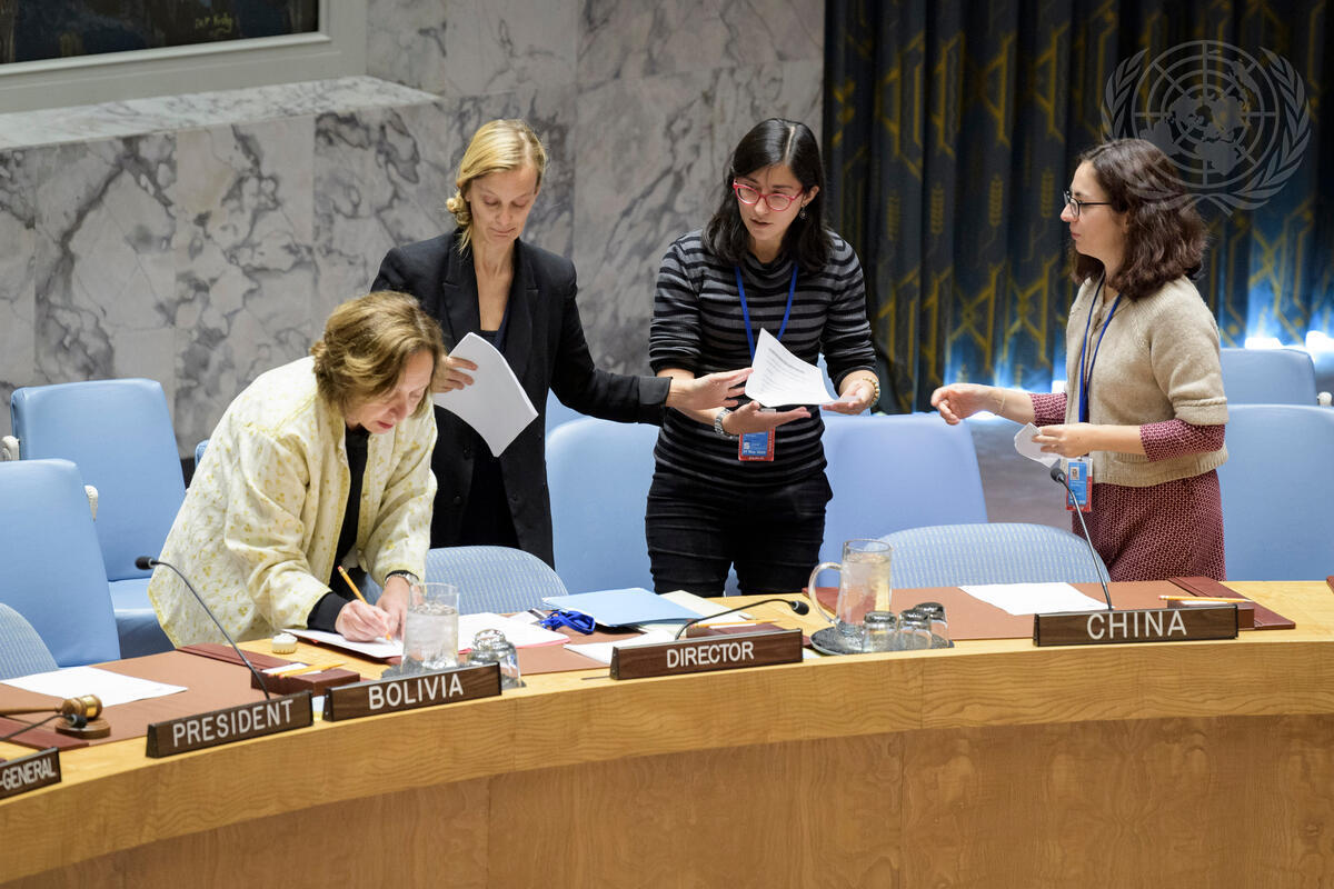 Staff from Department of Political Affairs and Department of General Assembly and Conference Management in the Security Council chamber, prior to the meeting on peace and security in Africa, during which the Council unanimously adopted Resolution 2439 (2018) on Ebola in the Democratic Republic of the Congo (DRC).