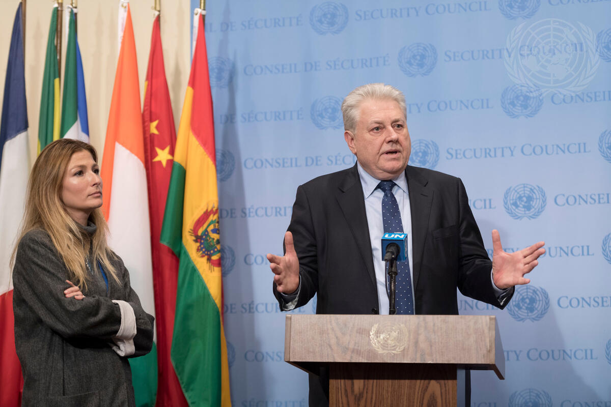 Volodymyr Yelchenko, Permanent Representative of Ukraine to the UN, speaks to journalists after the Security Council meeting on the situation in the Ukraine. At left is Emine Dzhaparova, Deputy Minister of Information Policy of Ukraine.