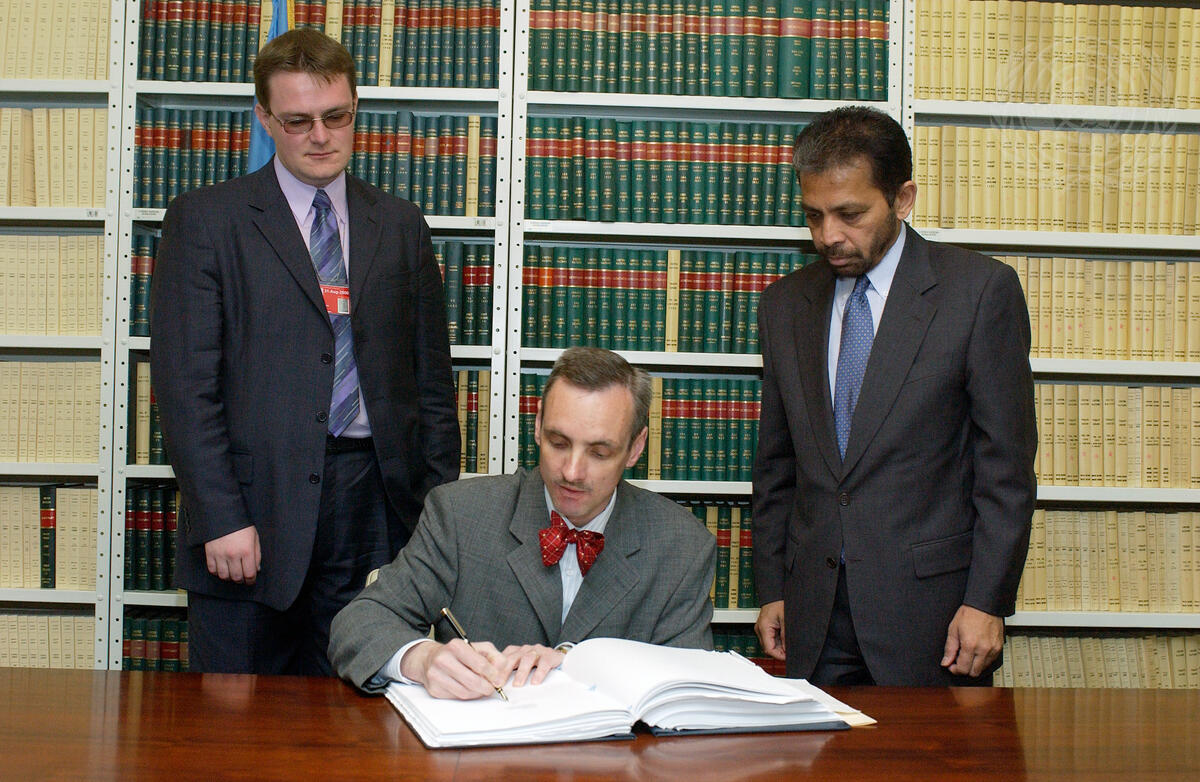 Ambassador Gints Jegermanis (seated), Permanent Representative of Latvia, signs the World Health Organization Framework Convention on Tobacco Control.
