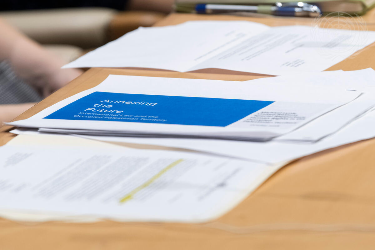 Papers on a desk during the meeting of the Committee on the Exercise of the Inalienable Rights of the Palestinian People.