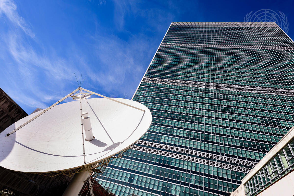 A view of the Secretariat building at United Nations Headquarters with a satellite dish in the foreground.