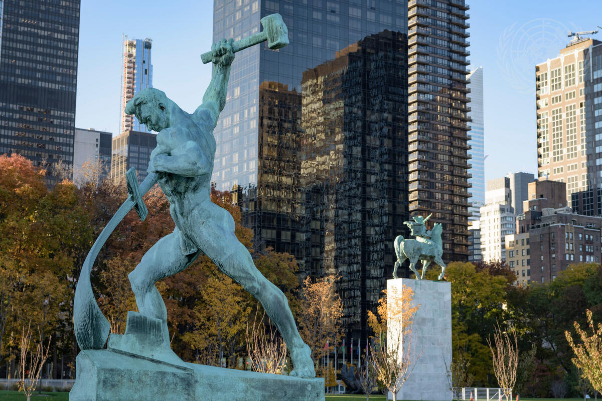 A view of the bronze statue, ""Let Us Beat Swords into Ploughshares"", by Soviet sculptor Evgeny Vuchetich, in the north garden area of UN Headquarters. The sculpture symbolizes the desire to put an end to war and convert the means of destruction into creative tools for the benefit of all.