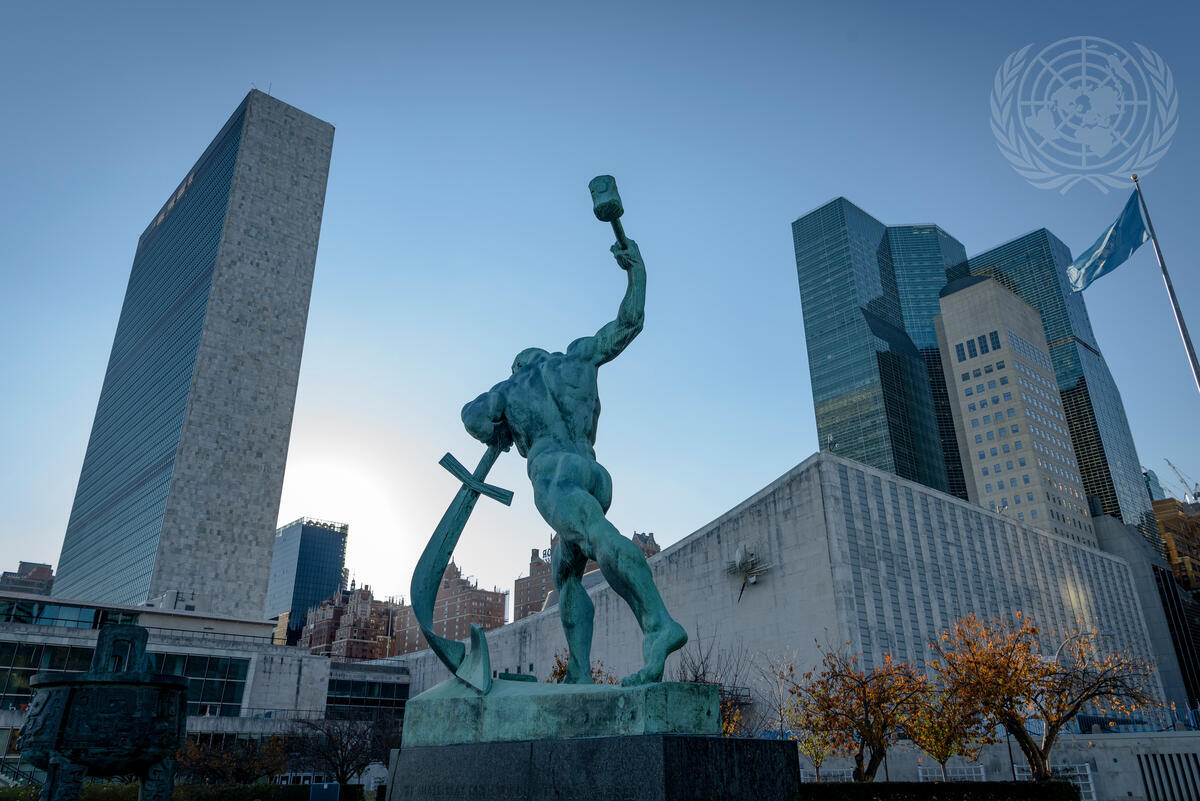A view of the bronze statue, "Let Us Beat Swords into Ploughshares", by sculptor Evgeny Vuchetich in the garden at UN Headquarters. The sculpture symbolizes the desire to put an end to war and convert the means of destruction into creative tools for the benefit of all. In the background is the Secretariat building and the General Assembly building.