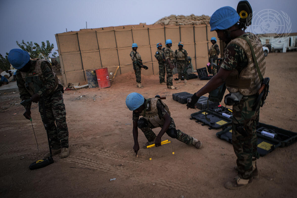 Peacekeepers conduct a search for landmines and explosive devices on a road inside the UN base in Kidal.