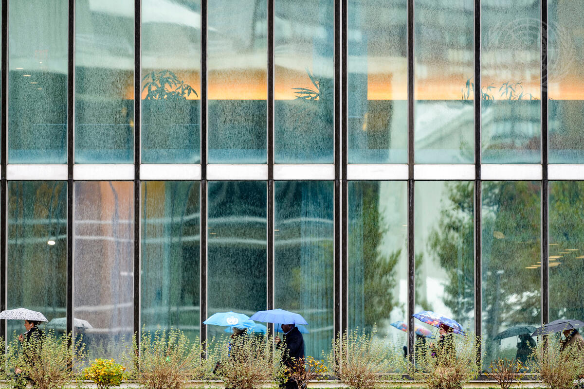A view of UN staff members arriving for work at the Secretariat building on a rainy day.