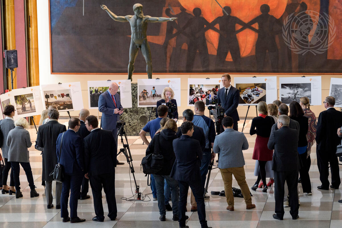 Alison Smale, Under-Secretary-General for Global Communications, makes remarks at the opening of the exhibit of 2018 Winners of the Andrei Stenin International Press Photo Contest. Behind her at left is Vassily Nebenzia, Permanent Representative of Russian Federation to the UN, and at right is Andrey Blagodyrenko, CEO of the ""Rossiya Segondnya"" News Agency.