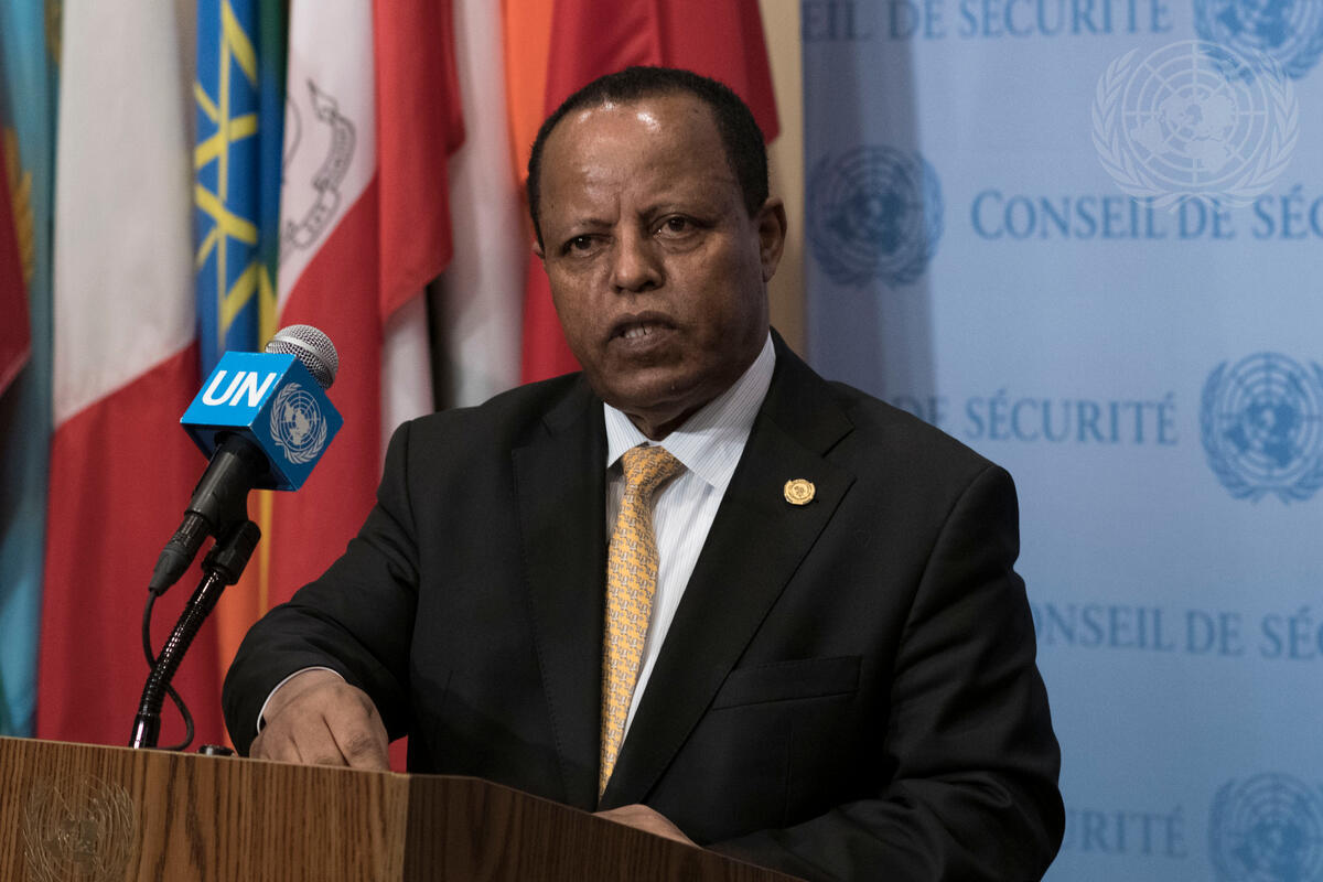 Taye Atske Sellassie Amde, Permanent Representative of the Federal Democratic Republic of Ethiopia to the United Nations, briefs press before the Security Council meeting on the situation in Somalia and Eritrea.