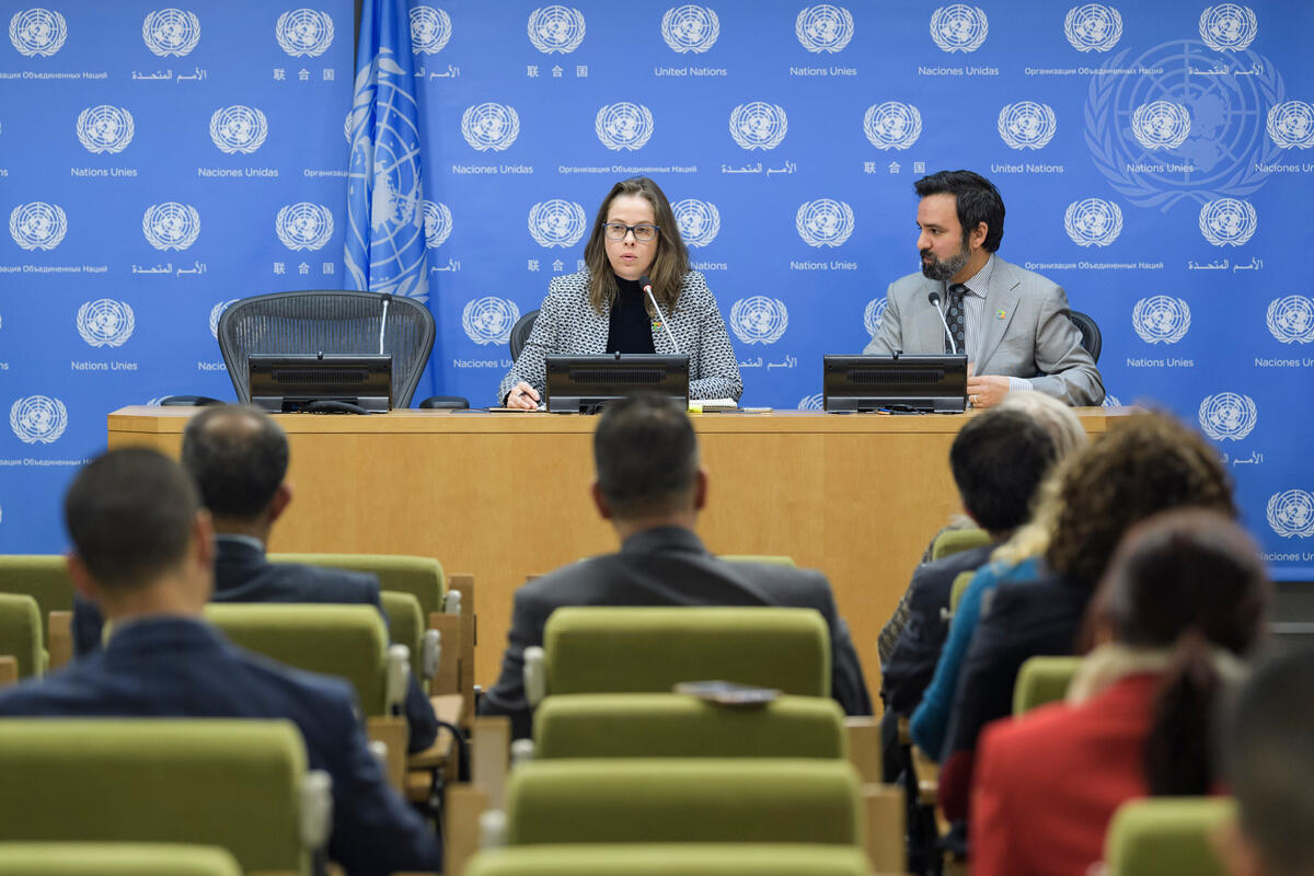 Amena Yassine (centre), Senior Adviser to the President of the General Assembly, briefs reporters on the High-Level Meeting on Peacebuilding and Sustaining Peace (24-25 April 2018). At right is Brenden Varma, Spokesperson for the President of the General Assembly.