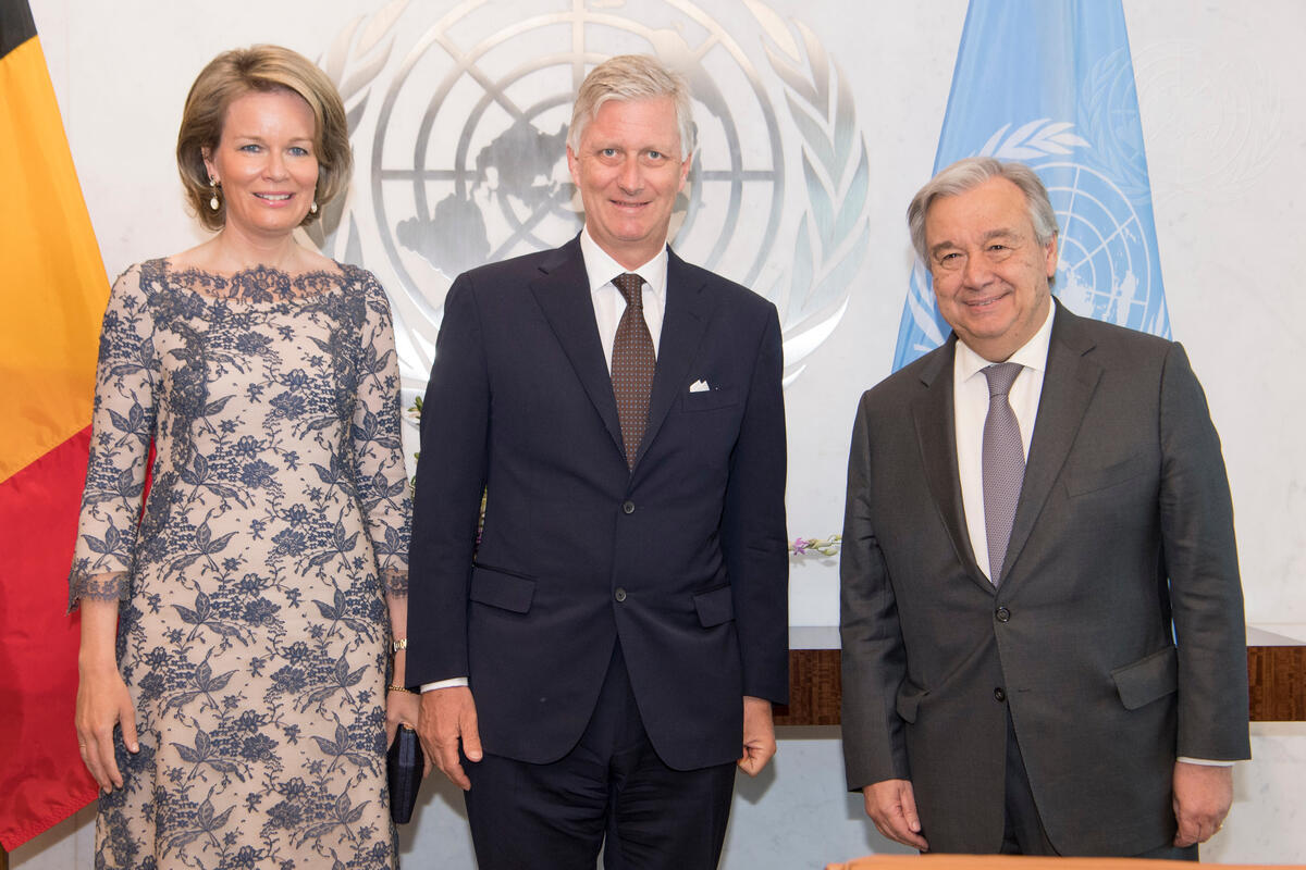 Secretary-General António Guterres (right) meets with King Philippe (centre) and Queen Mathilde of Belgium.