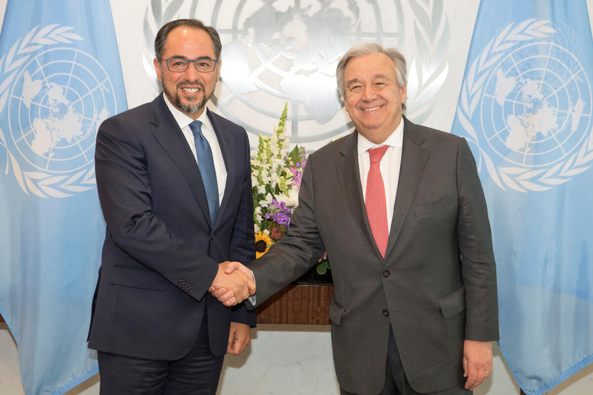 Secretary-General António Guterres (right) meets with Salahuddin Rabbani, Minister for Foreign Affairs of Afghanistan.