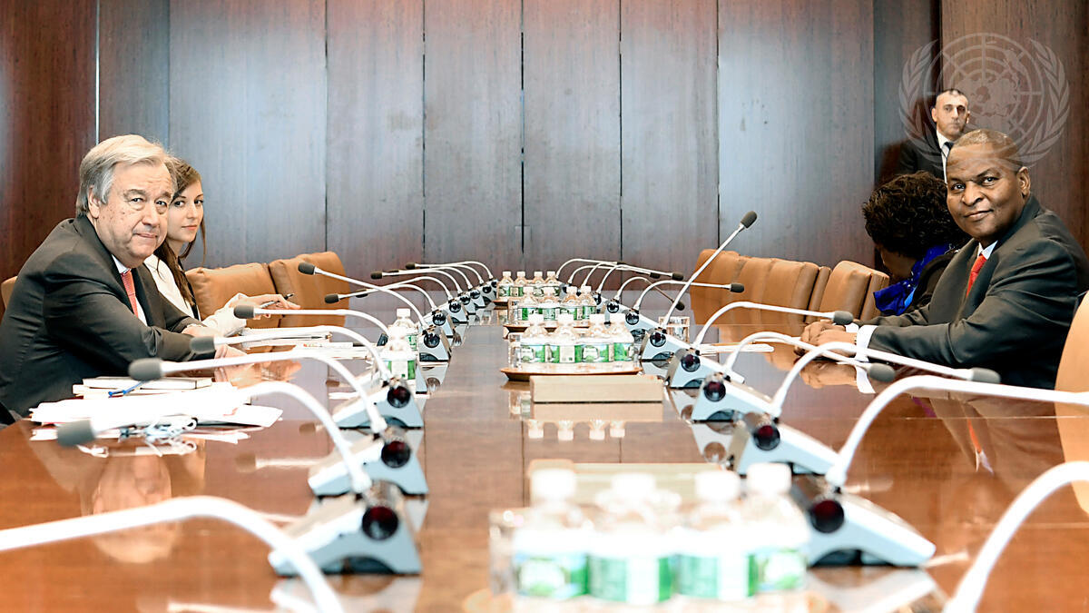 Secretary-General António Guterres (left) meets with Faustin Archange Touadera (right), President of the Central African Republic.