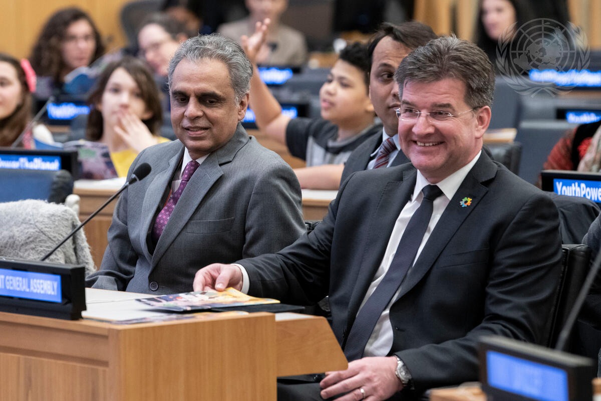 Miroslav Lajcák (right), President of the seventy-second session of the General Assembly, and Syed Akbaruddin (left), Permanent Representative of India to the United Nations, attend a special event entitled ""Youth Power the Planet: an SDG Activate Talk to Celebrate Earth Day"" on the occasion of International Mother Earth Day (22 April).
