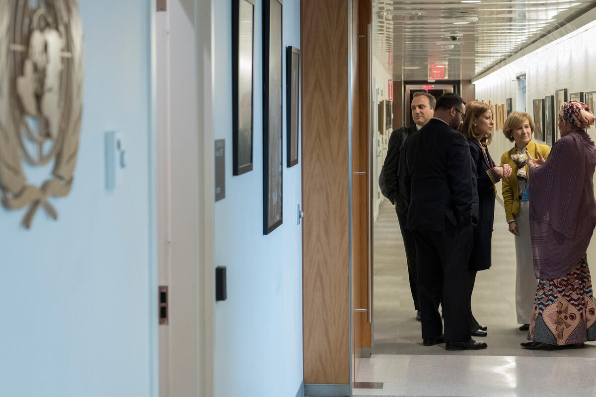 Deputy Secretary-General Amina Mohammed (right) speaks with Teresa Ribeiro (second from right), Secretary of State of Foreign Affairs and Cooperation of Portugal, following their meeting.