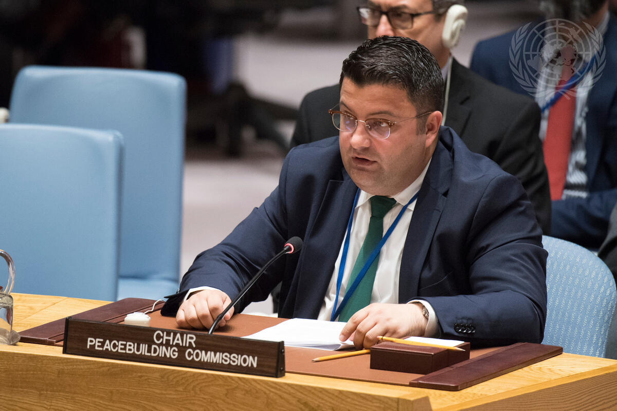 Dan Neculaescu, State Secretary for Regional Affairs and Multilateral Global Affairs in the Ministry of Foreign Affairs of Romania, and Chair of the Peacebuilding Commission, briefs the Security Council meeting on peacebuilding and sustaining peace.