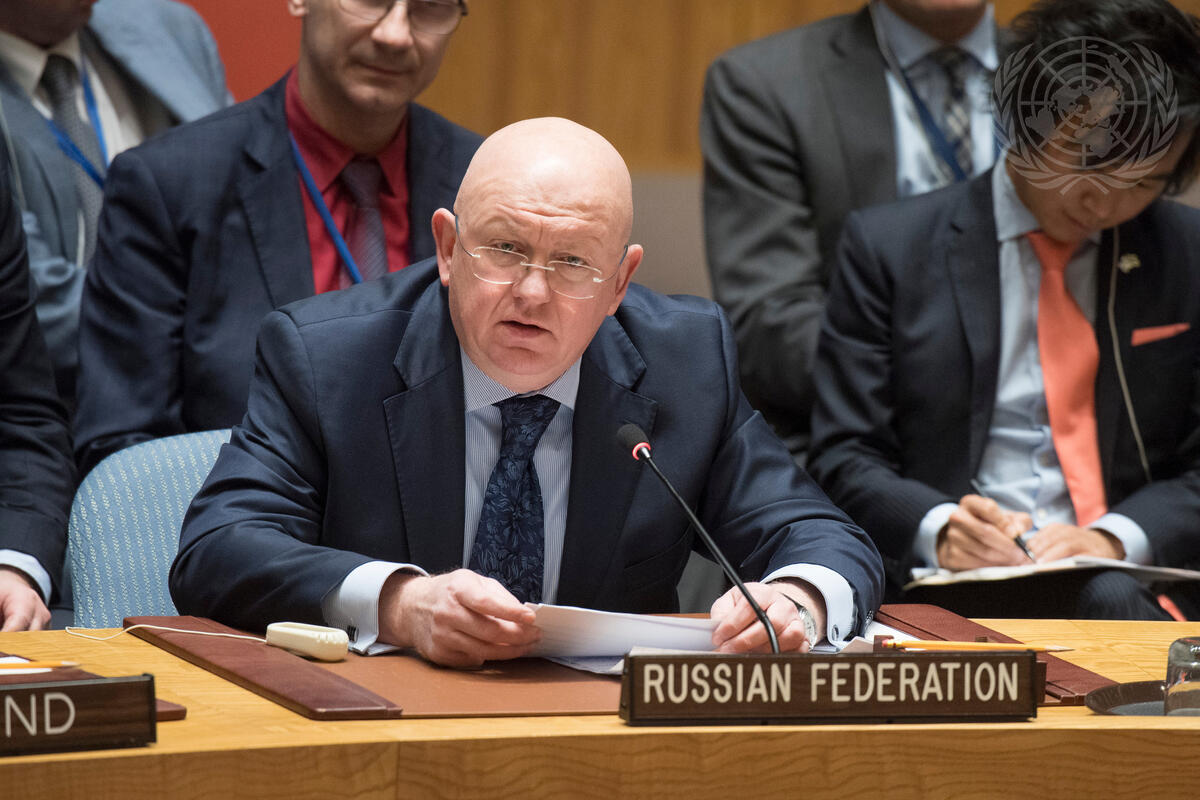 Vassily Nebenzia, Permanent Representative of the Russian Federation to the UN, addresses the Security Council meeting on the situation in the Middle East.