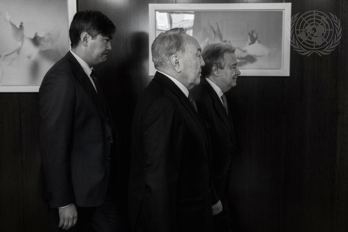 Secretary-General António Guterres (right) walks with Nursultan A. Nazarbayev (centre), President of the Republic of Kazakhstan, at United Nations Headquarters.