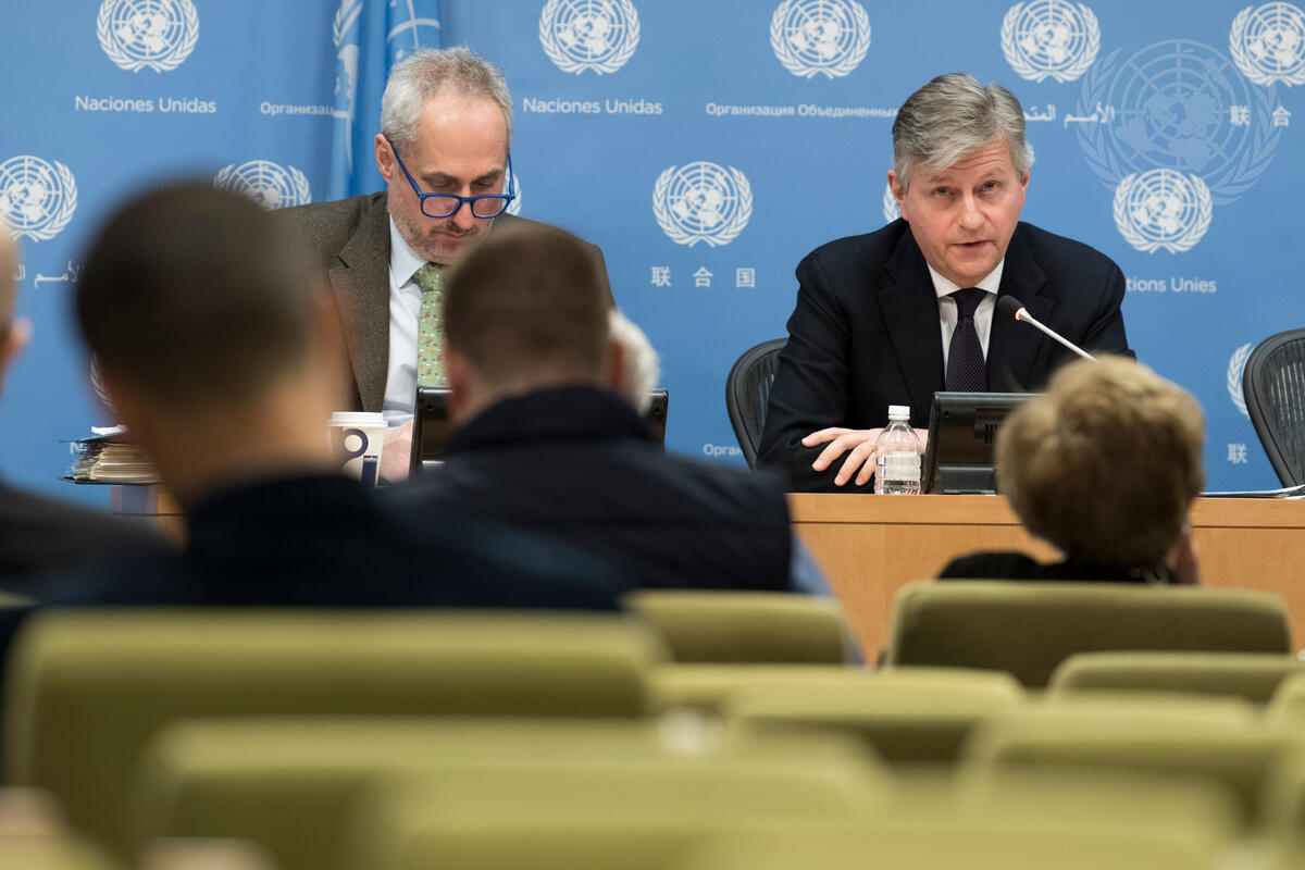 Jean-Pierre Lacroix (right), Under-Secretary-General for Peacekeeping Operations, briefs journalists. At his side is Stéphane Dujarric, Spokesman for the Secretary-General.