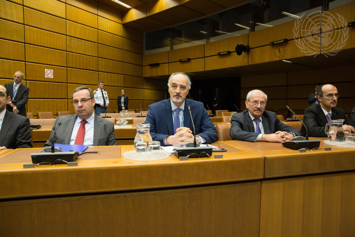 Bashar Ja'afari (centre), Permanent Representative of the Syrian Arab Republic to the United Nations, with the Syrian delegation, at a special meeting with the United Nations in the framework of the UN-facilitated Geneva political process.