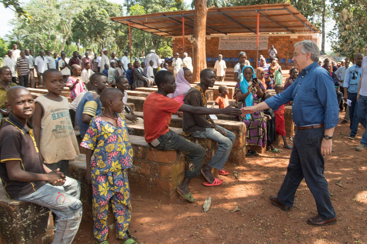 Secretary-General António Guterres (right) meets people living in a camp for internally displaced persons (IDPs) known as ""Site du Petit Seminaire St. Pierre Claver"", in the town of Bangassou.