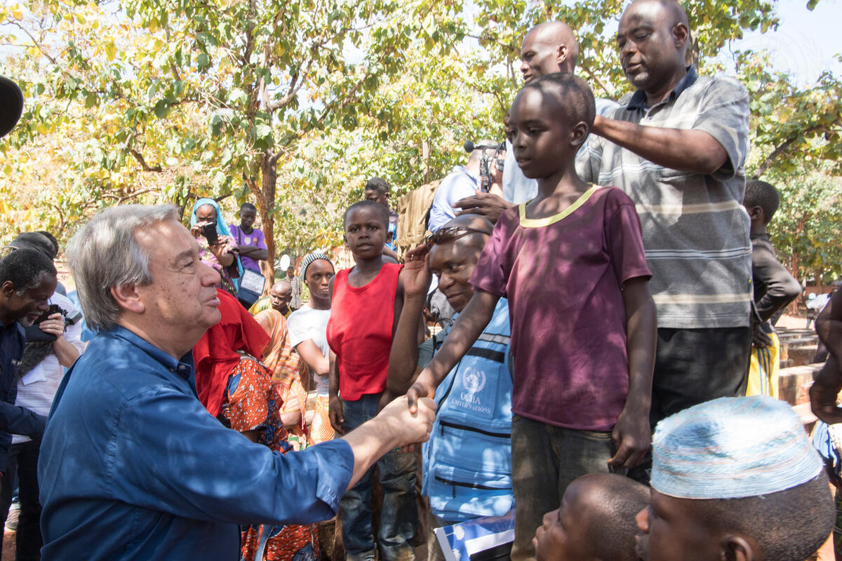 Secretary-General António Guterres (left) meets people living in a camp for internally displaced persons (IDPs) known as ""Site du Petit Seminaire St. Pierre Claver"", in the town of Bangassou.