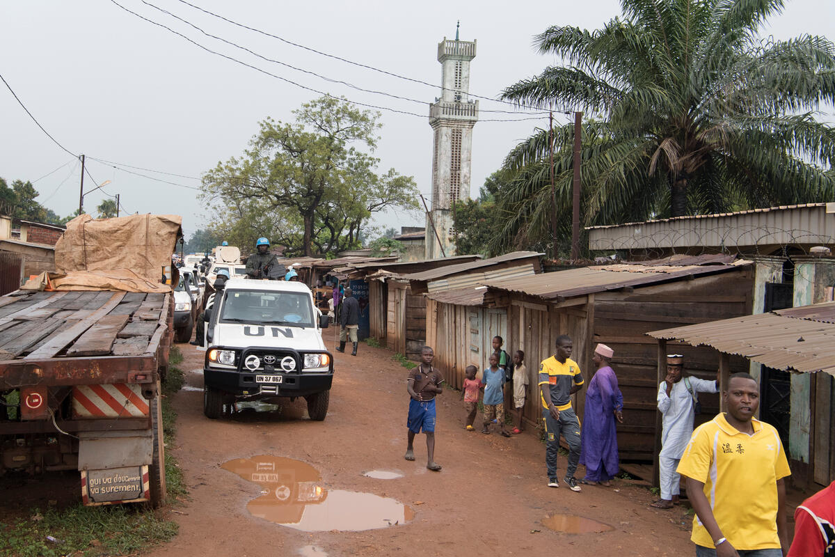 Military and police peacekeepers serving with the UN Multidimensional Integrated Stabilization Mission in the Central African Republic (MINUSCA) patrol the Muslim enclave of PK5 in Bangui.