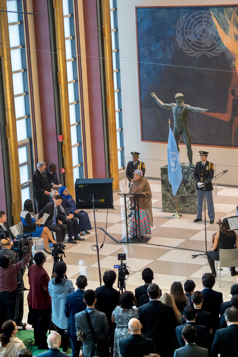 A view of the UN Headquarters Visitors Lobby as Deputy Secretary-General Amina Mohammed (at lectern) speaks at a ceremony to commemorate United Nations Day (24 October).