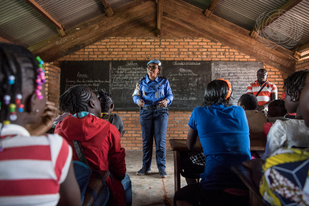 Gladys Ngwepekeum Nkeh, UN Police officer from Cameroon serving with the UN Multidimensional Integrated Stabilization Mission in the Central African Republic (MINUSCA), conducts a class on gender violence at a school in Bangui.
