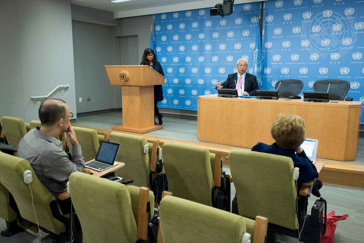 Jose Brillantes (top right), Chair of the Committee on the Protection of the Rights of All Migrant Workers and Members of Their Families, briefs journalists.
