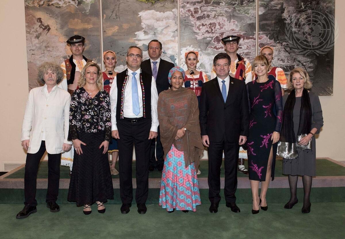 Event participants pose for a group photo with the Lúcnica Folklore Ballet prior to the performance. Miroslav Lajcák (front, third from right), President of the seventy-second session of the General Assembly, is flanked by his wife Jarmila Lajcáková-Hargašová (to his left), and Deputy Secretary-General Amina Mohamed (to his right). At far right is Alison Smale, Under-Secretary-General for Global Communications for the Department of Public information.