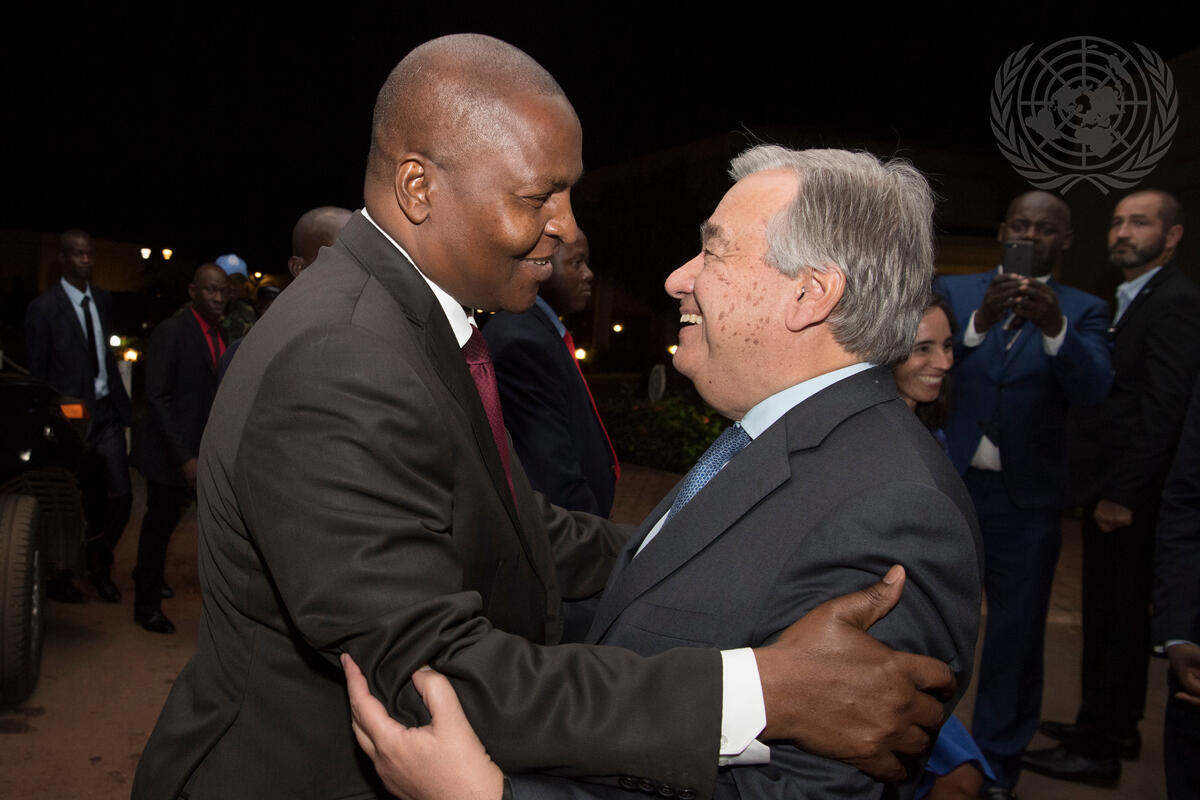 Secretary-General António Guterres (right) greets Faustin Archange Touadéra, President of the Central African Republic.